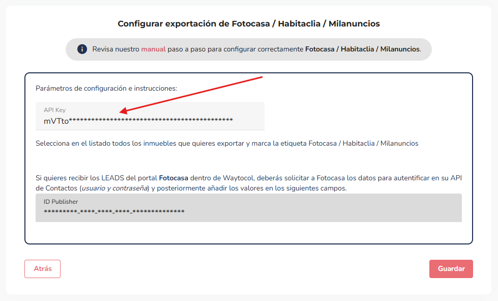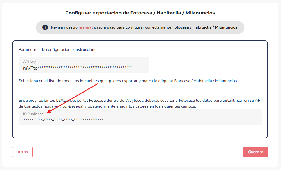 Esta vez Accede a tu cuenta de Waytocol, a la sección "Configuracion" --> "Publicación en portales" --> "click en el logo de Fotocasa"; y pegaremos el código de fotocasa del paso anterior. Después de introducir el código, asegúrate de hacer clic en "Guardar" para que la modificación se aplique correctamente.