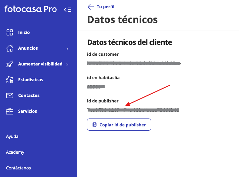 Accede a la sección "Datos técnicos" y copia el Id de publisher que te proporciona.